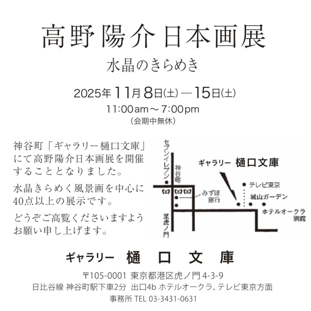 2025年11月8日11月15日 高野陽介日本画展、神谷町ギャラリー樋口文庫 2025年月11月8日(土) 〜 11月15日(土) 11:00~19:00虎ノ門ギャラリー樋口文庫〒105-0001 東京都港区虎ノ門4丁目3−9 2階TEL :03-3431-0631地下鉄日比谷線 神谷町駅 出口4b 徒歩2分